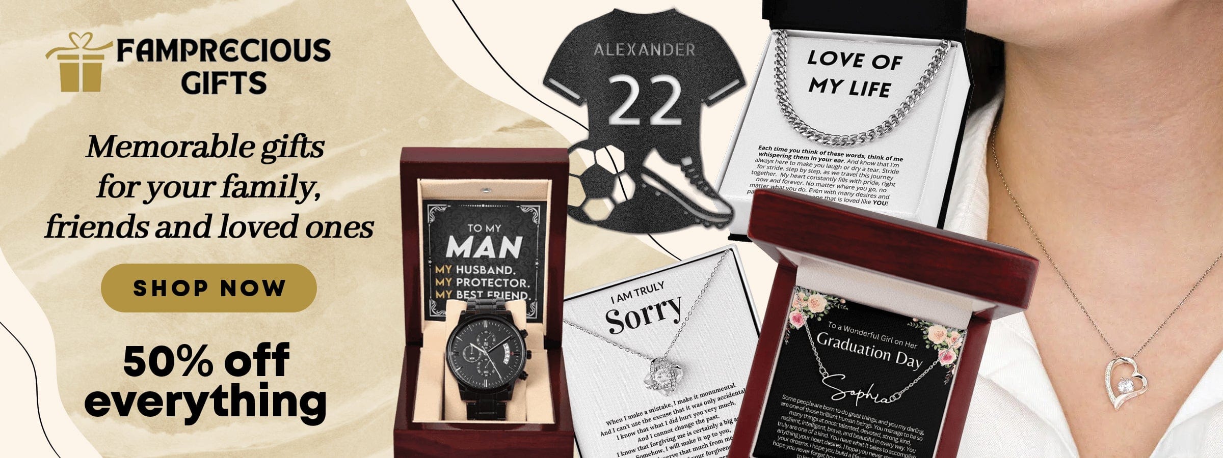 At Famprecious Gifts, we believe that every moment deserves to be celebrated and cherished. Our mission is to craft meaningful connections through thoughtful gifts that resonate with the heart and soul. From meticulously curated collections to personalized tokens of appreciation, we strive to make every occasion special and every gesture unforgettable. With a commitment to quality, creativity, and compassion, we aim to inspire moments of joy, gratitude, and connection that last a lifetime