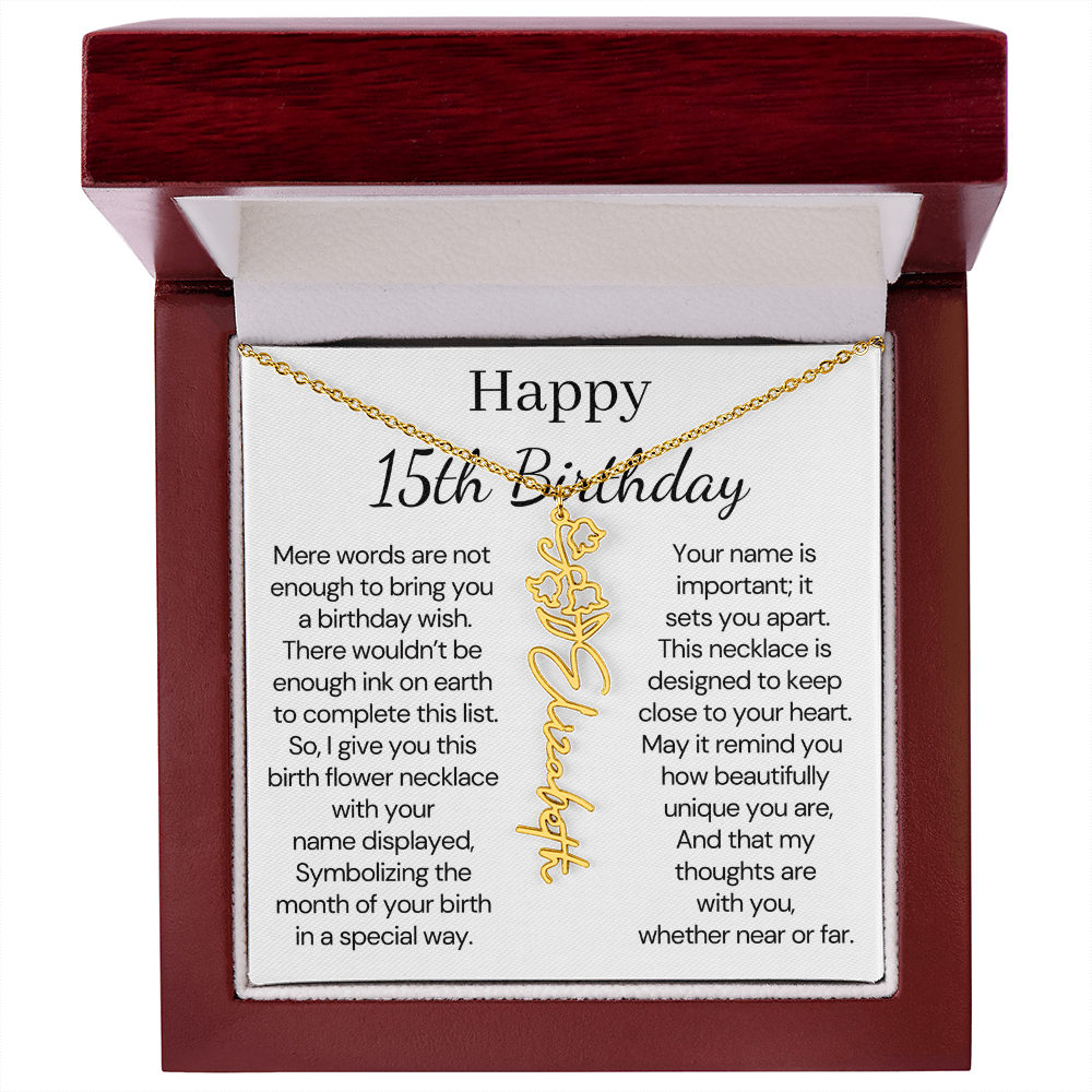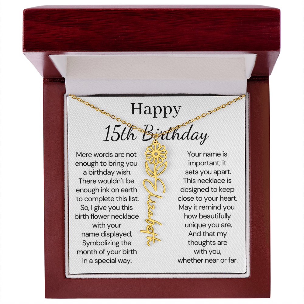Personalized 15th Birthday Gift for Her – Customized Birth Flower Name Necklace – 15th Birthday Jewelry Gift for Granddaughter, Daughter, or Niece