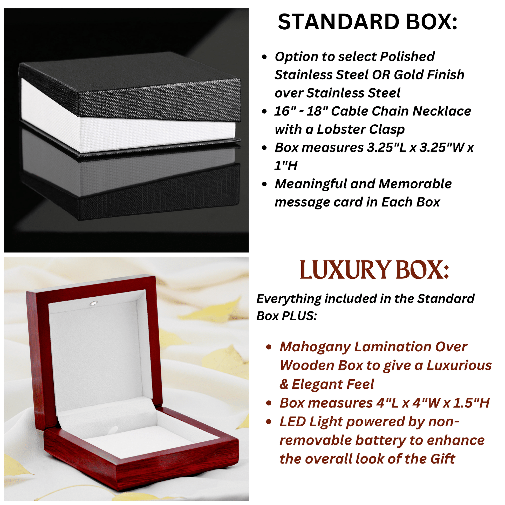 Your piece is lovingly packaged in a complimentary soft touch box for easy gifting. Elevate your presentation by upgrading to the mahogany style luxury box, which features a brilliant LED spotlight.